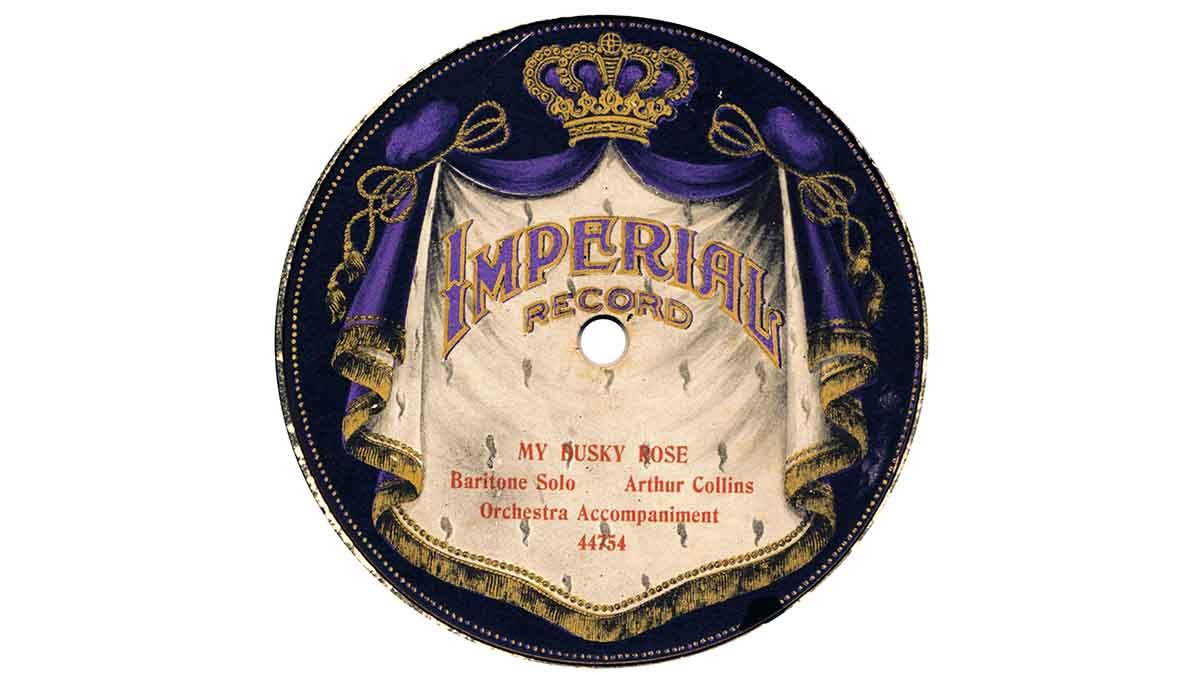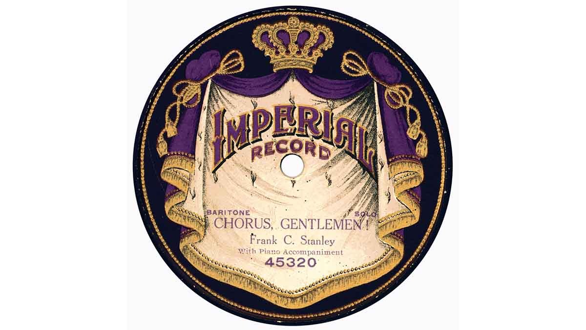 These first Imperials were made by the U.S. firm Leeds & Catlin of New York, and imported to the U.K. beginning about April 1906. They were single sided. 600 issues were available by January 1907. The small (~1.5″) ‘back-sticker’ is present only on some (early?) examples. This is probably because the sticker stipulates that the discs may only be used on a machine with a feed-screw – like a cylinder phonograph. This was part of a dodge to avoid infringing a U.S. patent. Surprising as it may seems to us, the fact that the sound-box playing a disc was carried across the disc by the very groove which it was tracking, was a crucial patent in the U.S. at the time. But as far as I know, it was totally irrelevant in the U.K., so eventually, no back-stickers? Imperial had some recordings, of exalted status, made for them in Europe, by Favorite. By way of contrast, in 1907 the famous Scottish baritone Ian Colquhoun went to the U.S. and recorded over 30 sides, presumably mainly for the British market. However, in 1909, after long-ongoing patent litigation, Leeds & Catlin were compelled to stop manufacturing discs. The residual stock was sold off cheaply; in this country, largely by Gamages. Single sided Imperials are quite scarce. Some of the Favorite sides were issued in the U.K. at higher prices. They had a different, black label featuring just the crown, and are excessively rare. In 1911 the trade mark was acquired by the Sound Recording Company – see below.