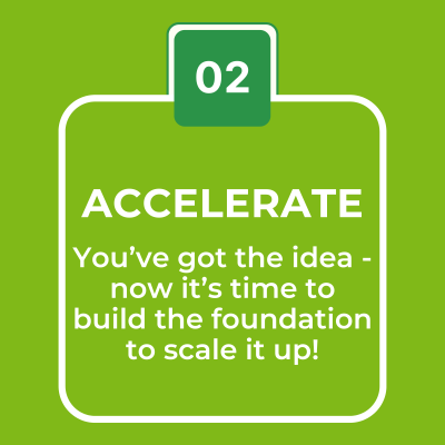 Refine and strengthen your business model. With targeted mentoring and practical workshops, Accelerate helps you to validate your ideas, understand your customers and put strong foundations in place for growth.