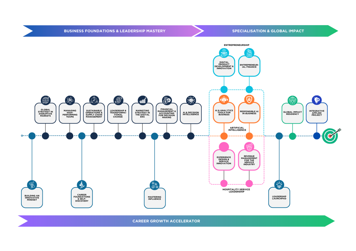 Alongside the compulsory modules, you can select from a broad range of electives, including three guided pathway routes: Artificial Intelligence, Hospitality Service Leadership, and Entrepreneurship. In addition, the flexible Integrative Applied Project - whether a business plan, consultancy project, or research report - allows you to apply your learning to a final project tailored to your career goals.
