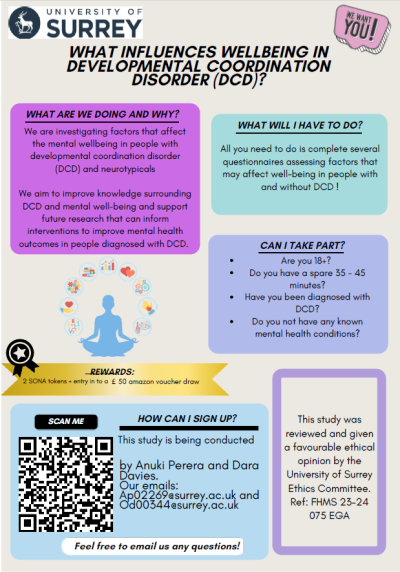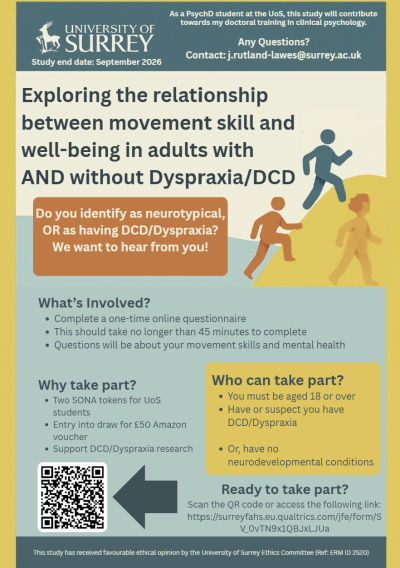 We are looking for participants aged 18 and over who have a diagnosis of DCD/Dyspraxia, or suspect you have DCD/Dyspraxia, OR have no neurodevelopmental conditions.