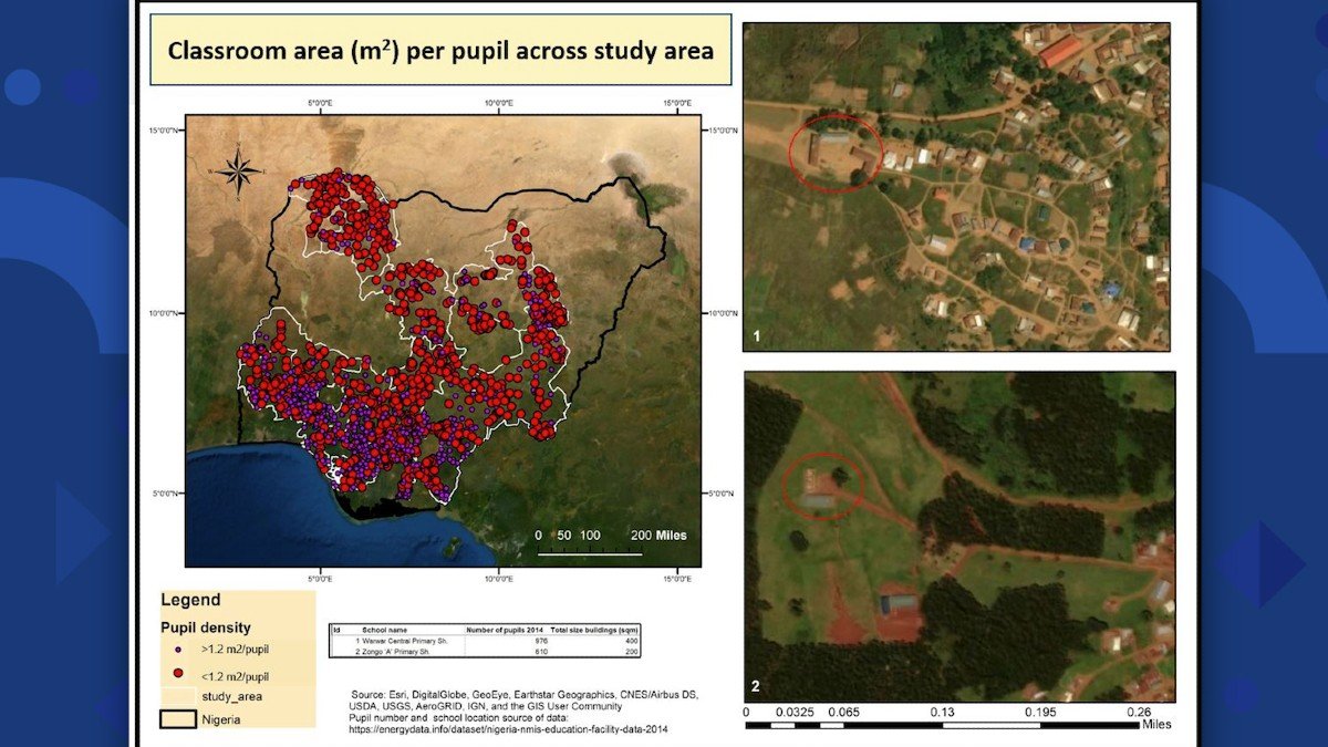 “This study examines the use of satellite Earth Observation (EO) to assess pupil density in primary schools in rural areas of Nigeria,” explains Ana. “EO satellite images help us determine the size of available teaching spaces. This information is coupled with a government database of enrolled pupil numbers in schools.