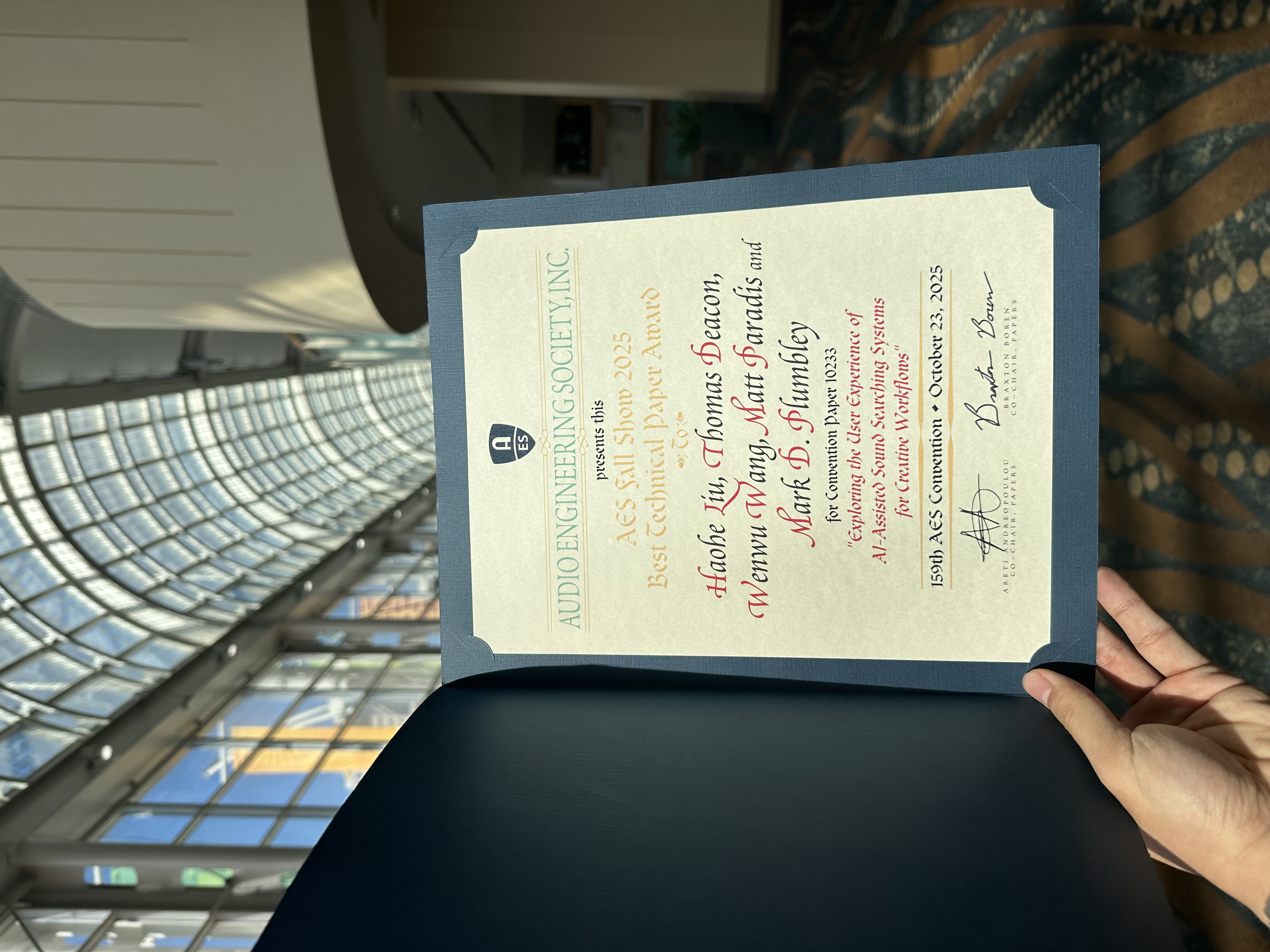 [10/2025] Best Technical Paper Award from the Audio Engineering Society (AES) for our paper: H. Liu, T. Deacon, W. Wang, M. Paradis and M. D. Plumbley, "Exploring the User Experience of AI-Assisted Sound Searching Systems for Creative Workflows," 159th Audio Engineering Society Convention, Long Beach, CA, USA, October 23–25, 2025. Thanks to AES! [PDF] [award certificate] [award ceremony] [CVSSP News] [PAI News]