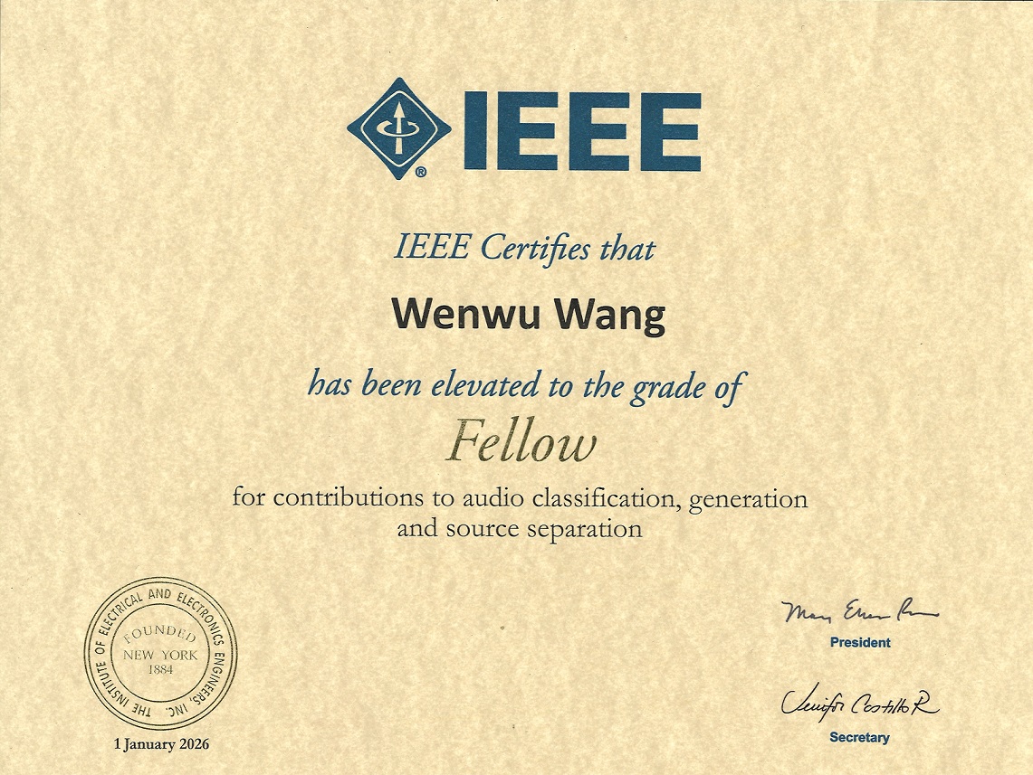 [12/2025] Elected to IEEE Fellow for "contributions to audio classification, generation, and source separation", effective on 1st January 2026. [PAI news][CVSSP news] [University news] [Surrey Headlines] [IEEE Signal Processing Society Newsletter] [IEEE Signal Processing Magazine News] [IEEE Fellow class 2026] [IEEE Fellow certificate]